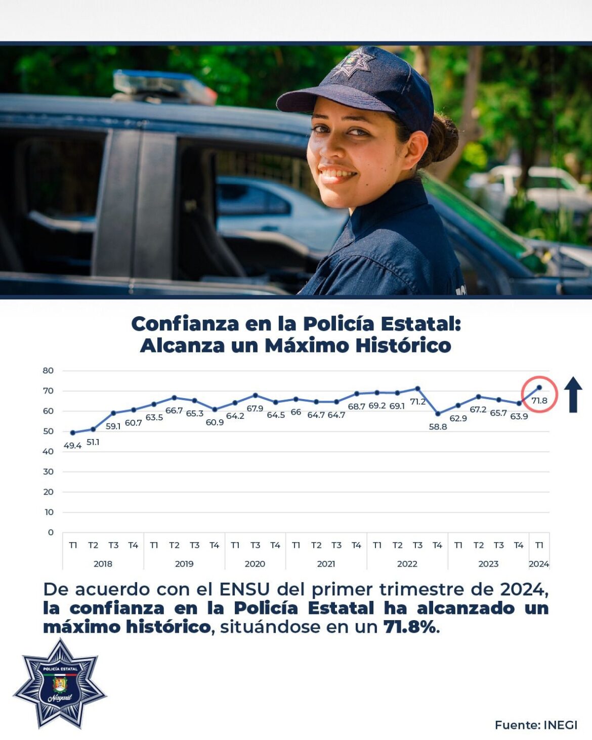 📝El INEGI a través de la encuesta ENSU del primer trimestre de 2024, informa que la confianza en la Policía Estatal ha alcanzado un máximo histórico, situándose en un 71.8%.