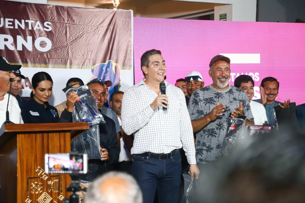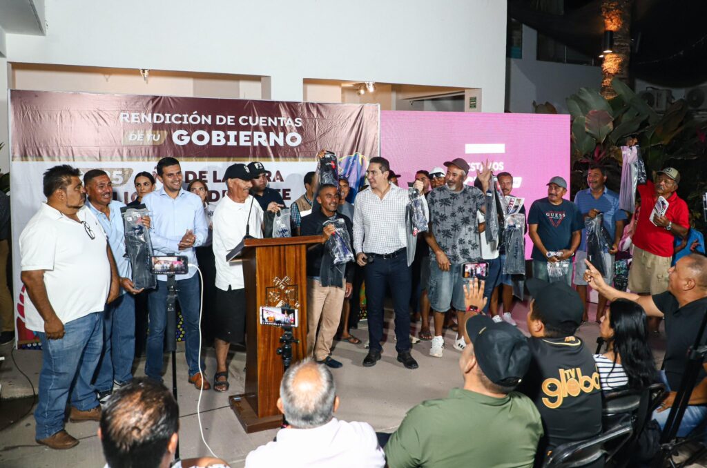 Durante la jornada, también se reconoció a más de 60 pescadores de #Bucerías, quienes recibieron visores, aletas y un apoyo económico de 2 mil pesos cada uno. Además, se realizó una rifa entre el gremio de buzos, en la que cuatro de ellos fueron premiados con 10 mil pesos. “Hoy los pescadores de Bahía de Banderas tienen justicia y un gobierno que les cumple por igual”, afirmó el presidente, al tiempo que giró instrucciones para apoyar la jornada de limpieza del arroyo El Indio, iniciativa propuesta por los propios trabajadores del mar.