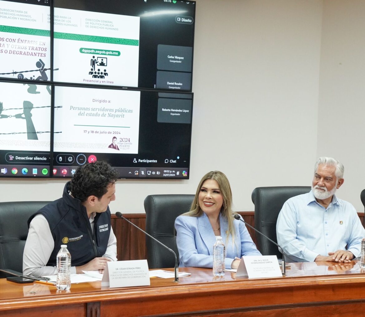 Esta mañana, en el Auditorio de la Secretaría de Desarrollo Sustentable de Nayarit, en representación del gobernador del estado, Miguel Ángel Navarro Quintero, la secretaria general de Gobierno, Rocío Esther González García, dio inicio al “Curso en Derechos Humanos con Énfasis en la Prevención de la Tortura y otros Tratos o Penas Crueles, Inhumanos o Degradantes”, el cual señaló, se llevará a cabo durante dos días y se abordarán tres módulos con diferentes temas y capacitaciones, a fin de conocer e identificar las herramientas para prevenir la tortura, así́ como los derechos humanos vulnerados y dotar a las y los servidores públicos de los elementos necesarios en su labor diaria.