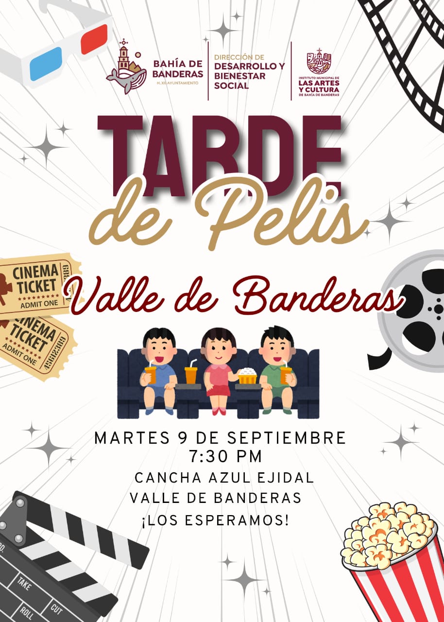 El Gobierno Municipal de Bahía de Banderas, encabezado por el alcalde Héctor Santana, invita a todas las familias a disfrutar de una nueva edición de Tarde de Pelis, en esta ocasión, la cita será en punto de las 7:30 de la noche en la Cancha Azul Ejidal de Valle de Banderas, se invita a todas las familias a disfrutar de una función gratuita de cine al aire libre, además de la proyección, los asistentes podrán compartir un ambiente festivo con palomitas y bebidas.