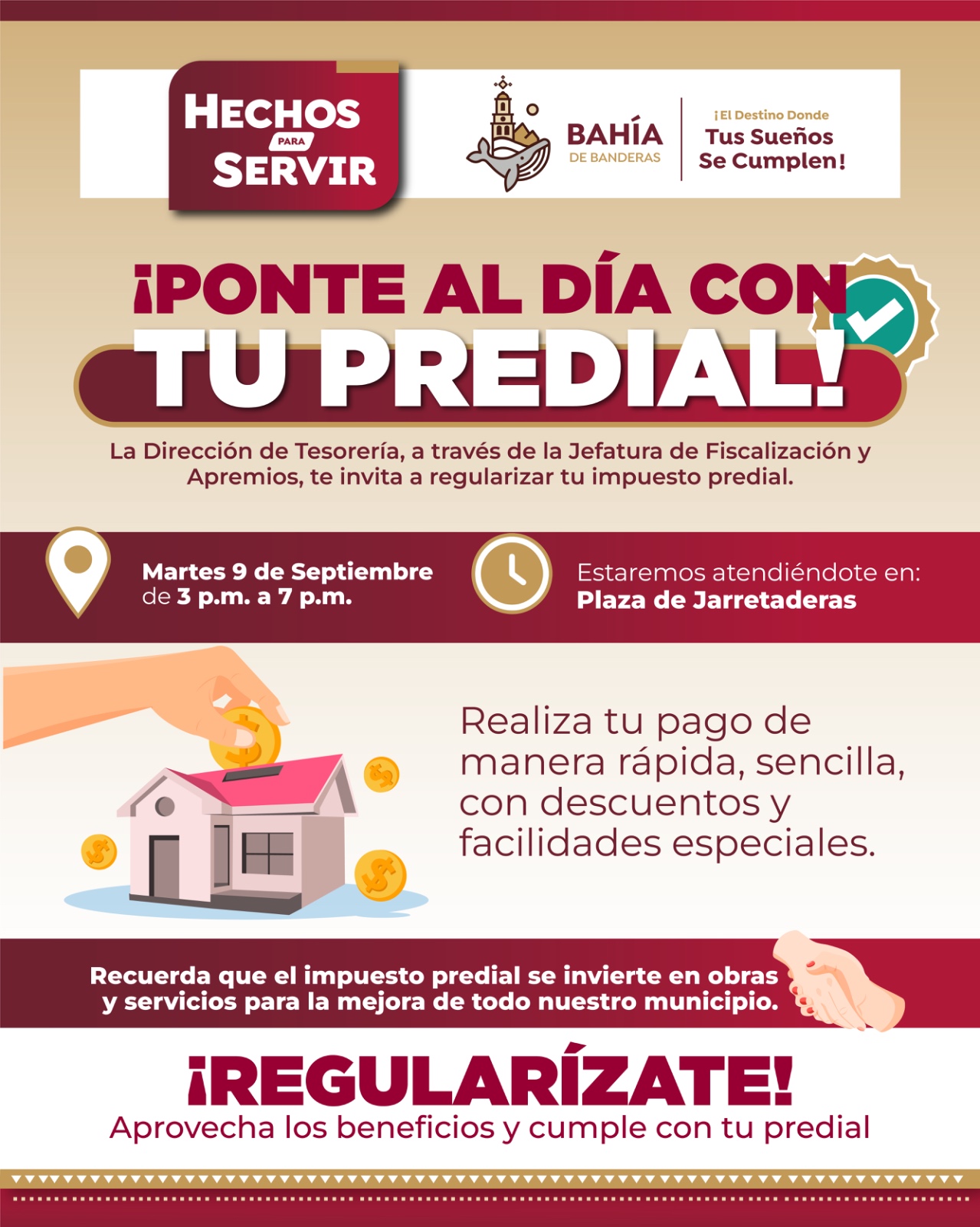 El Gobierno Municipal de Bahía de Banderas, a través de la Dirección de Tesorería y la Jefatura de Fiscalización y Apremios, invita a la ciudadanía a aprovechar las jornadas especiales de regularización del impuesto predial.