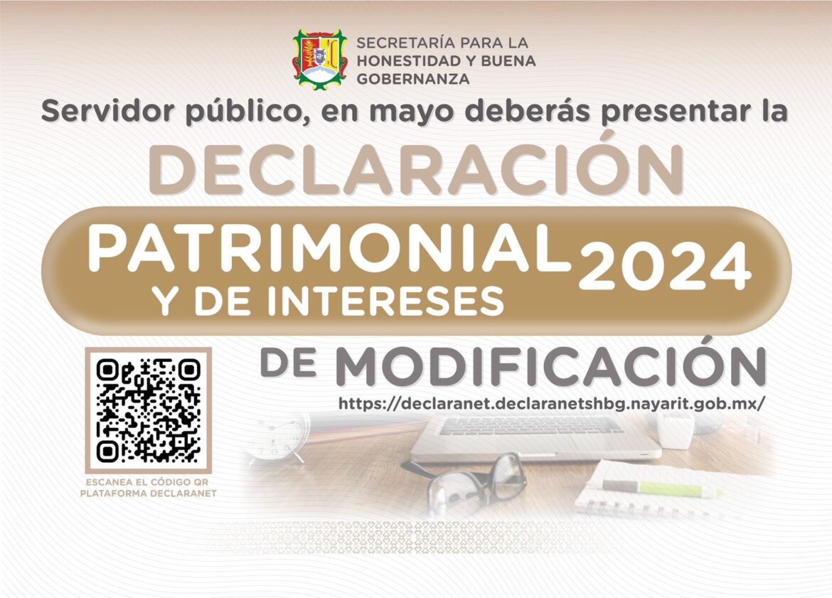 La Secretaría para la Honestidad y Buena Gobernanza informó que, a partir del 01 de mayo del año en curso, las y los servidores públicos del estado de Nayarit tienen la obligación constitucional de realizar su declaración patrimonial y de intereses en su modalidad de modificación 2024. Se presentará en línea a través del sistema DeclaraNet: https://declaranet.declaranetshbg.nayarit.gob.mx; esto como parte de las acciones de transparencia, rendición de cuentas y combate a la corrupción.