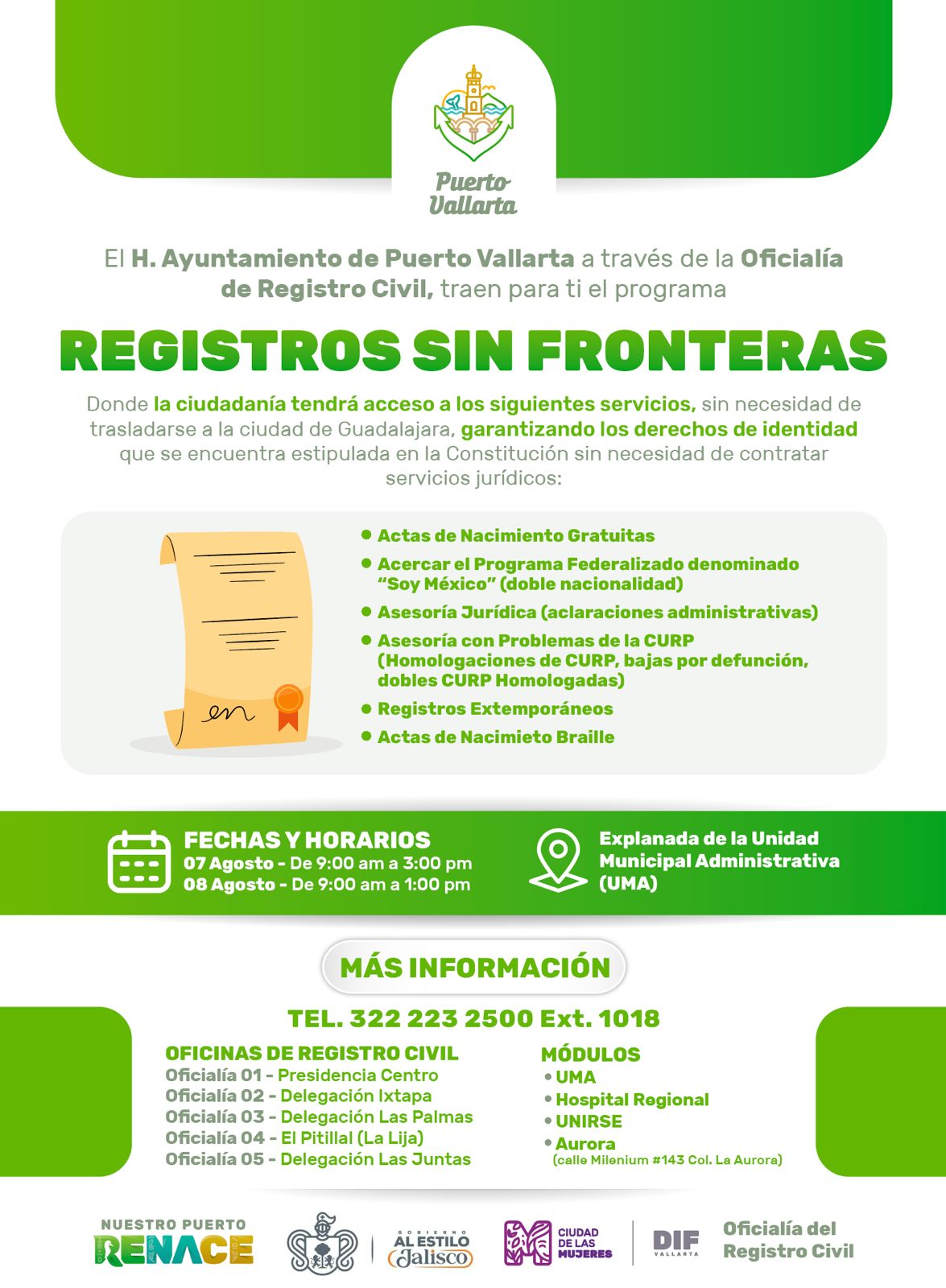 Los ciudadanos de Puerto Vallarta podrán acceder a una variedad de servicios de registro civil sin tener que viajar a Guadalajara, gracias al programa «Registro sin Fronteras» que impulsa el gobierno estatal y que es respaldado por la administración del alcalde Luis Munguía a través de la Oficialía del Registro Civil de esta ciudad.