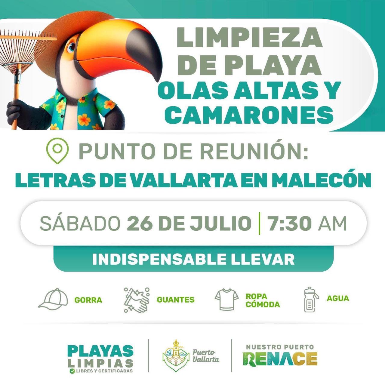 Con el fin de proteger nuestros ecosistemas costeros, este sábado 26 de julio se llevará a cabo una jornada de limpieza en las playas Olas Altas y Camarones. La cita es a las 7:30 de la mañana en las letras de “Puerto Vallarta”, ubicadas en el malecón. Esta actividad busca reducir la contaminación que afecta al mar y a la flora y fauna marina.